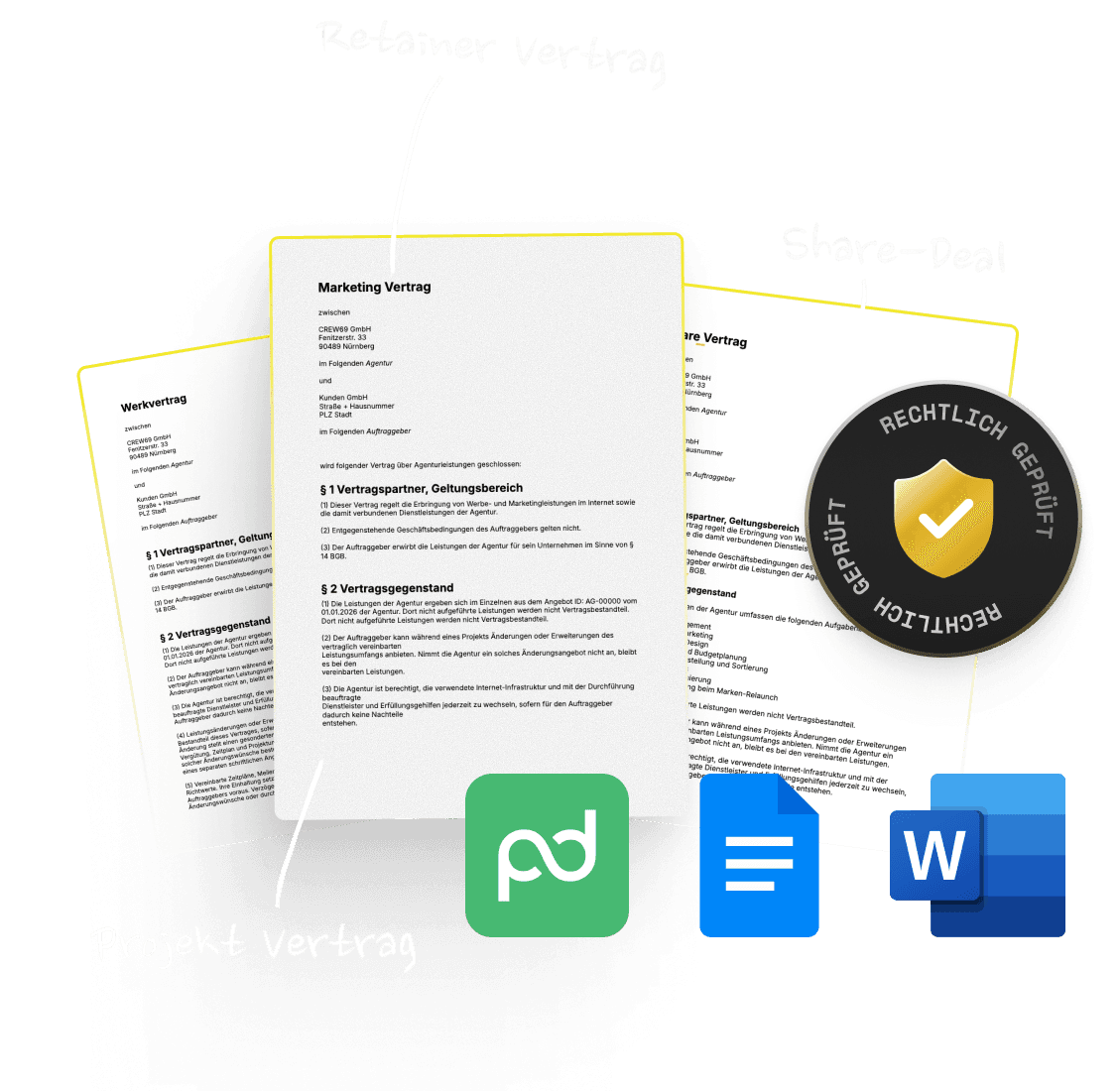 Drei durchdachte Templates für Projektarbeit, Retainer und Share-Deals – mit sinnvollem Aufbau und klaren Platzhaltern.