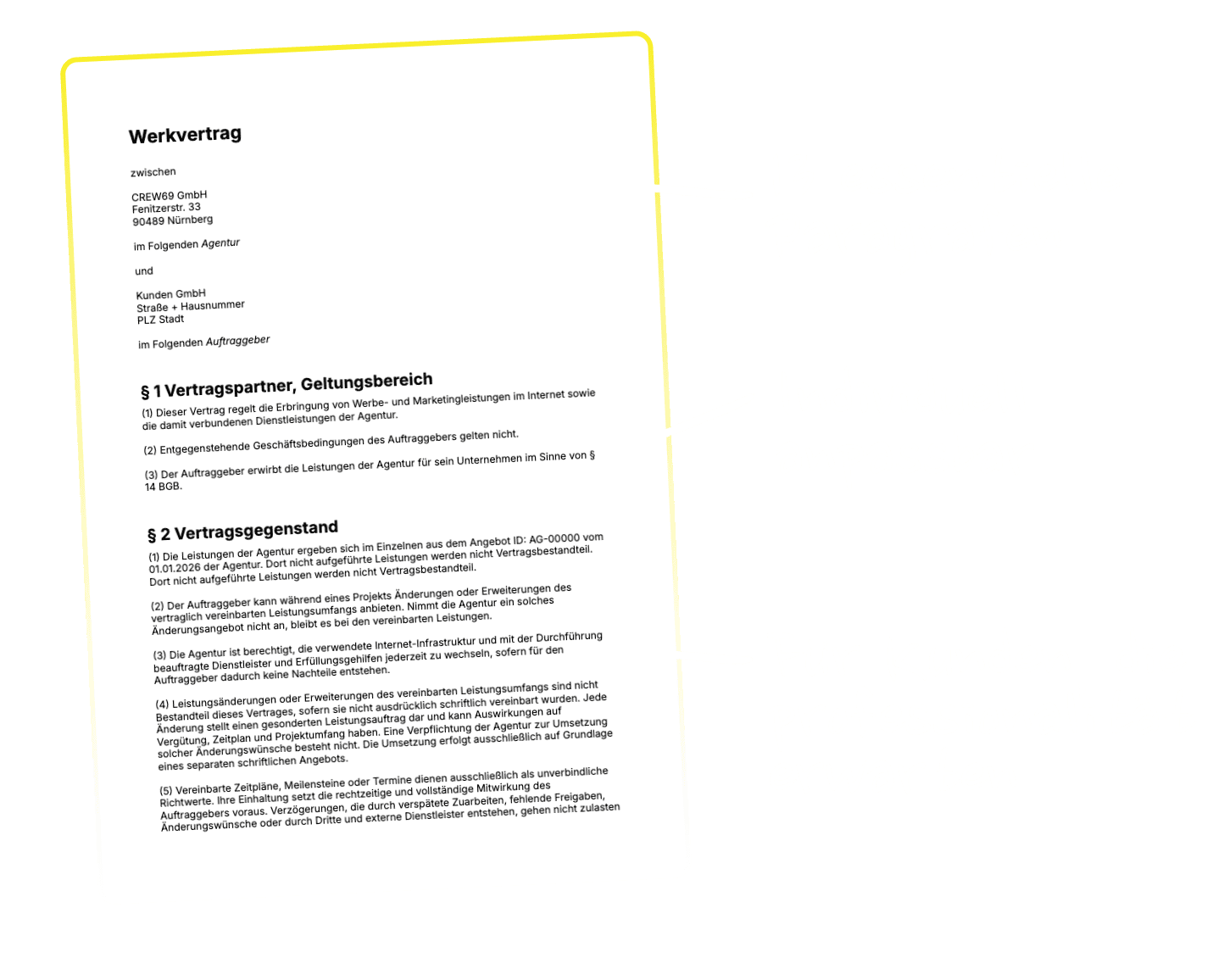 Für Freelancer und Agenturen mit Projektarbeit. Klärt Leistung, Vergütung und Laufzeit von Anfang an.